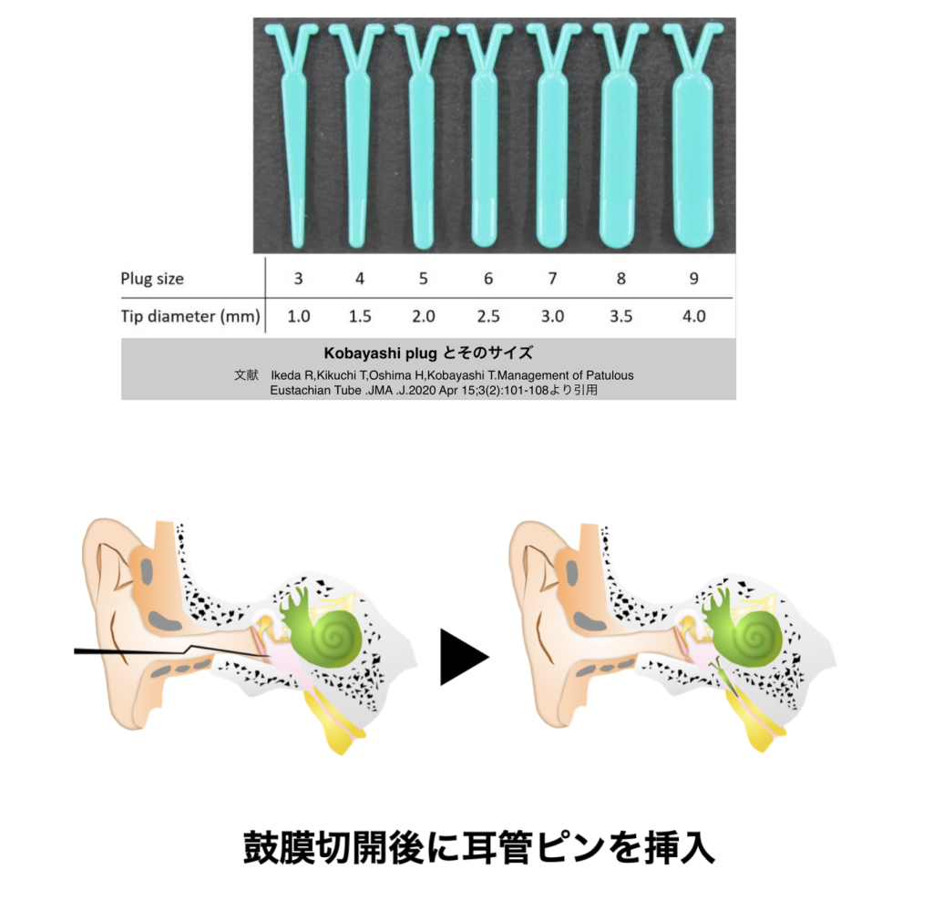 やや大きめの鼓膜切開を行ったのち、鼓膜を通して鼓膜の奥にある耳管方向にシリコン製のピン(Kobayashi plug)を挿入します。